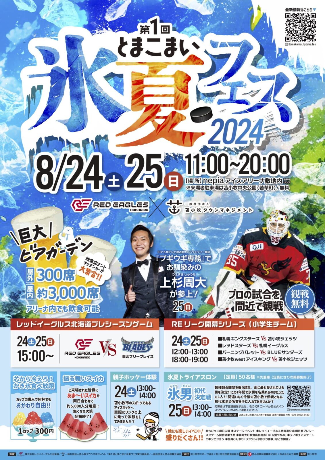 「とまこまい氷夏フェス」は、苫小牧タウンマネジメント 氷都みらいプロジェクトと、レッドイーグルス北海道がタッグを組み今回新たに開催されるイベントです(上杉周大の出演は8/25(日)の予定です)。